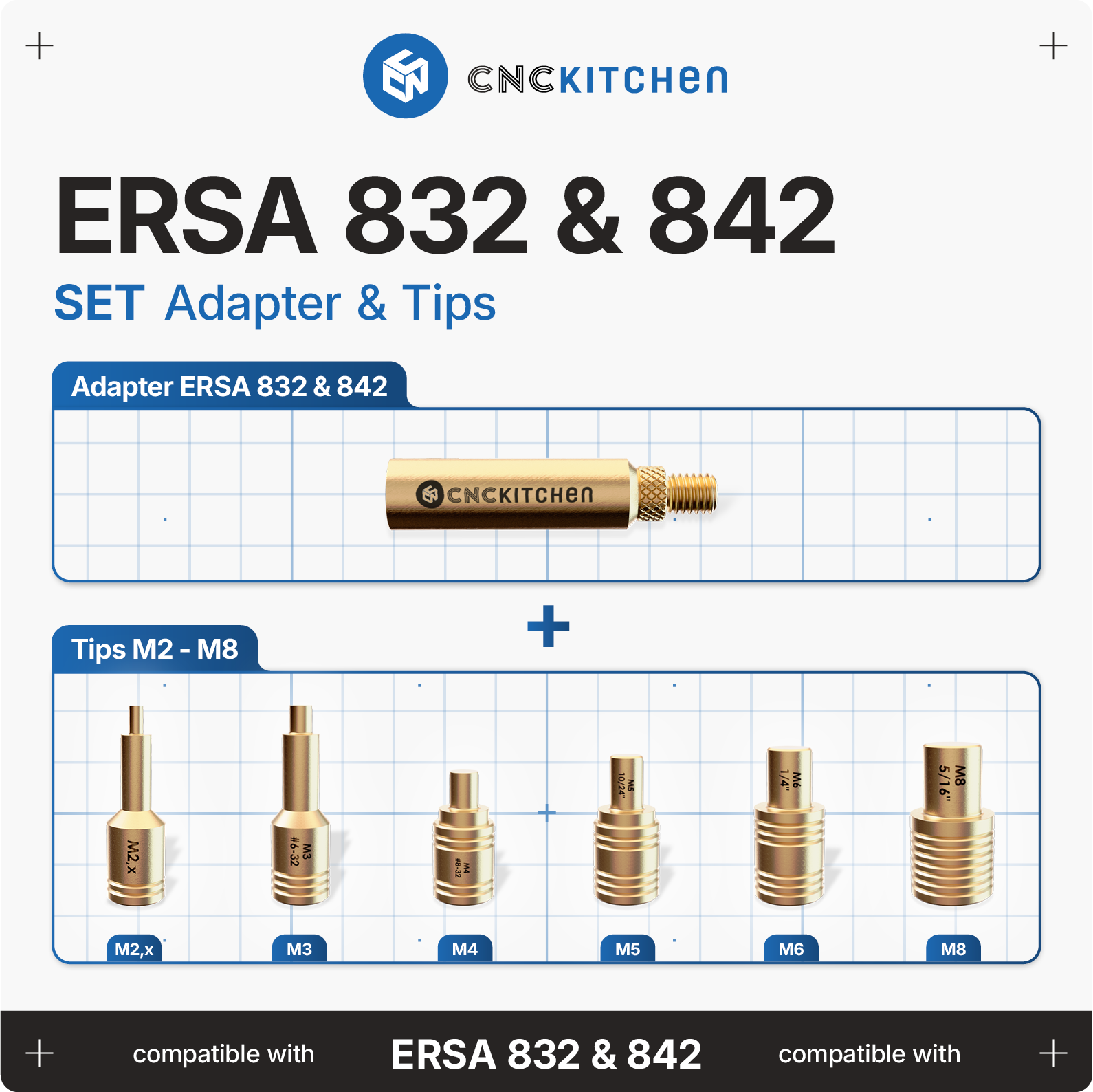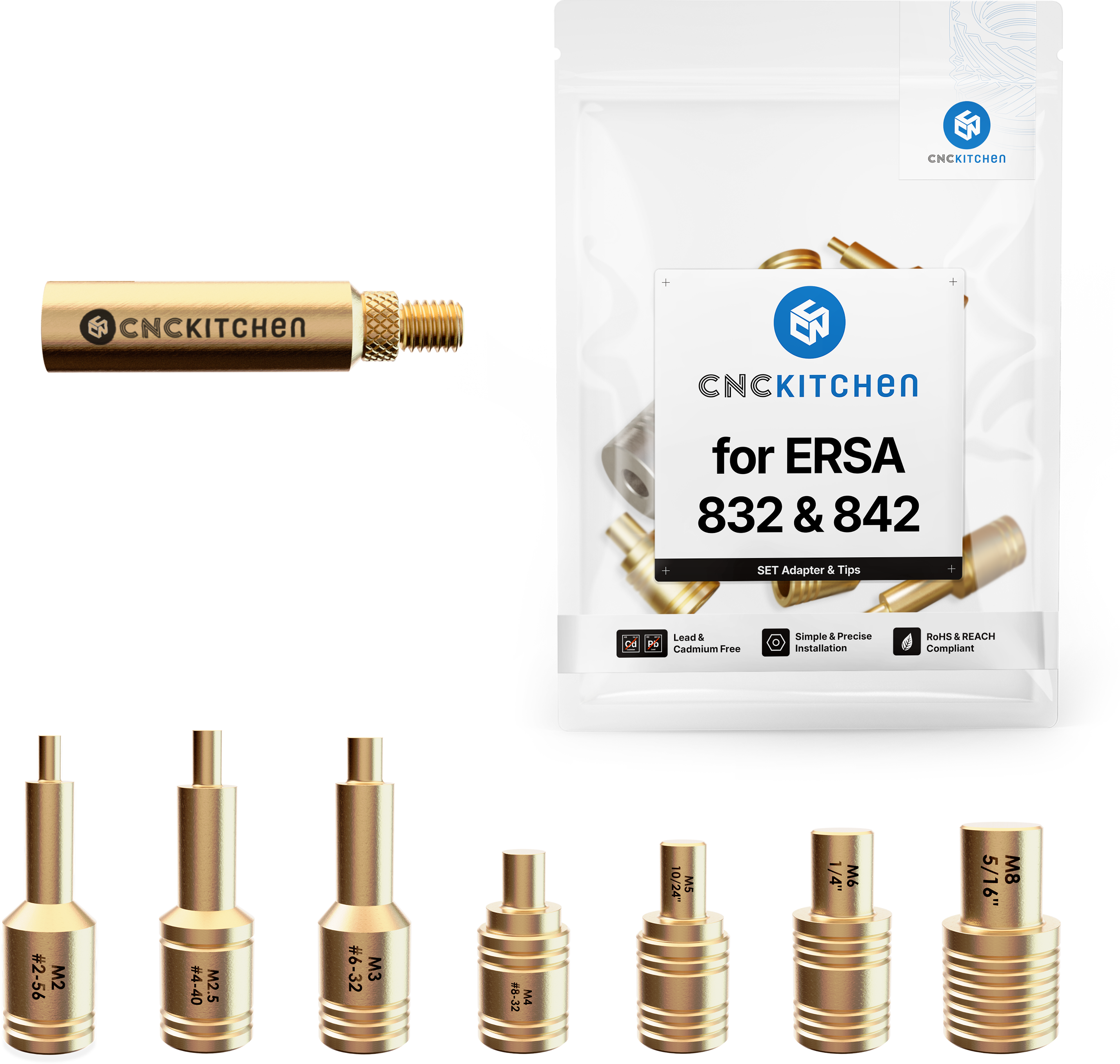Vrhovi za lemljenje kompatibilni su s ERSA ERGO TOOL, MULTI-PRO, MULTI-SPRINT, MULTI-TC, PTC 70 i POWER TOOL lemilicama i savršeno su usklađeni s CNC Kitchen umetcima za navoje. Imaju laserske oznake i ureze za jednostavnu identifikaciju veličine. Sukladno REACH-u.