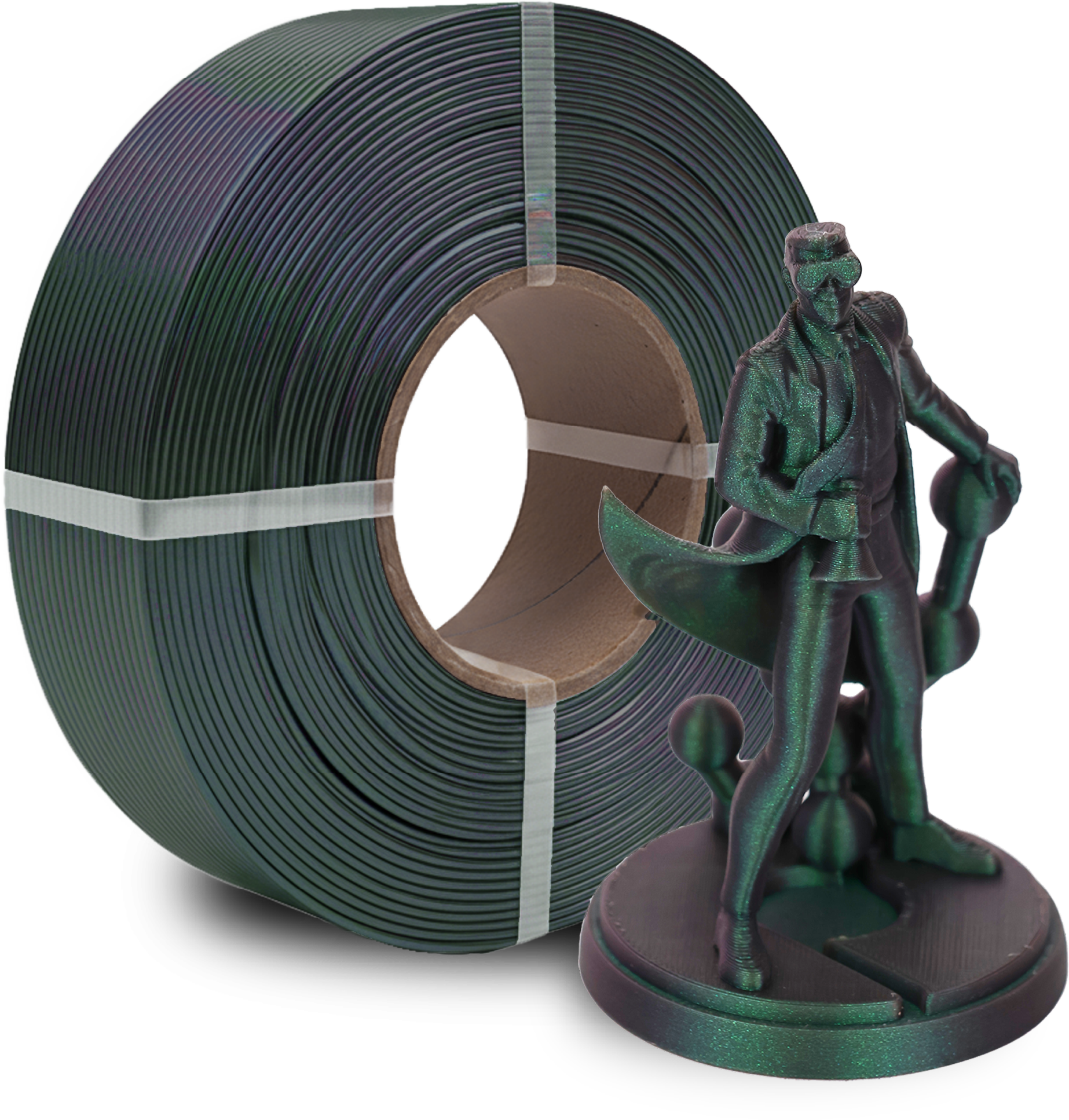 Polymaker Refill sastoje se od uredno namotanog filamenta bez čvrste špule. Dizajnirani su za postavljanje na višekratnu Master špulu. Polymaker nudi vlastitu Polymaker MasterSpool kao STL datoteku koju možete ispisati sami (vidi pod Preuzimanja ili preuzmite na MakerWorld).