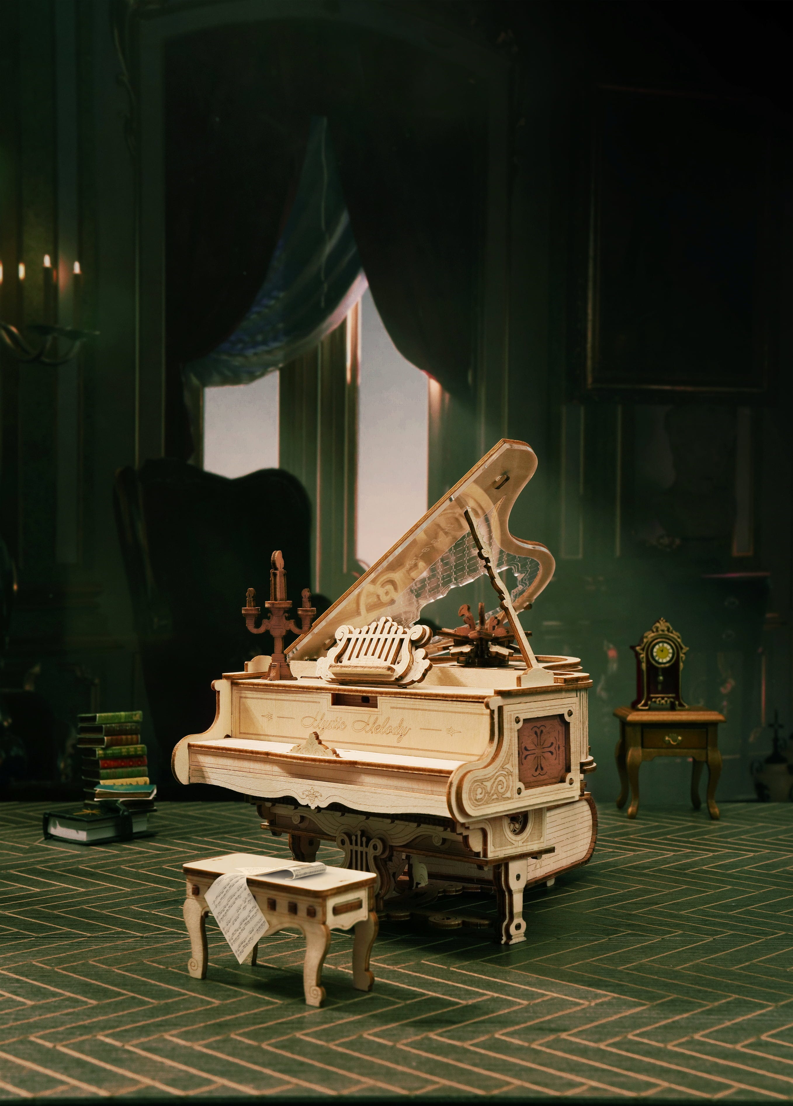 Klasika, potpuno bez struje: Magic Piano radi potpuno bez baterija. Mehanički navijajući mehanizam pokreće model i svira verziju glazbene kutije Pachelbelov „Kanon u D“. Melodija koja savršeno odgovara elegantnoj sceni.