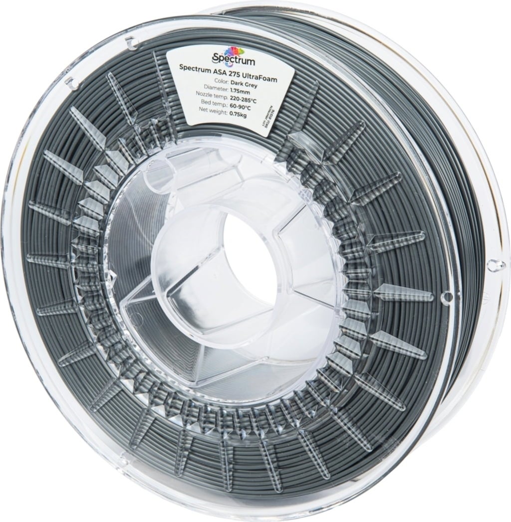 Spectrum LW-ASA UltraFoam je specijalizirani visokoučinkoviti filament koji kombinira otpornost na vremenske uvjete i UV zračenje ASA s tehnologijom aktivnog pjenjenja. Kroz kontrolirano širenje tijekom postupka ispisa moguće su značajne uštede u težini – u ekstremnim slučajevima do trostrukog povećanja volumena uz istovremeno smanjenje gustoće na oko 0,33 g/cm³. Ovo čini materijal idealnim za primjene gdje su podjednako važni težina, mehanička otpornost i otpornost na vremenske uvjete.
