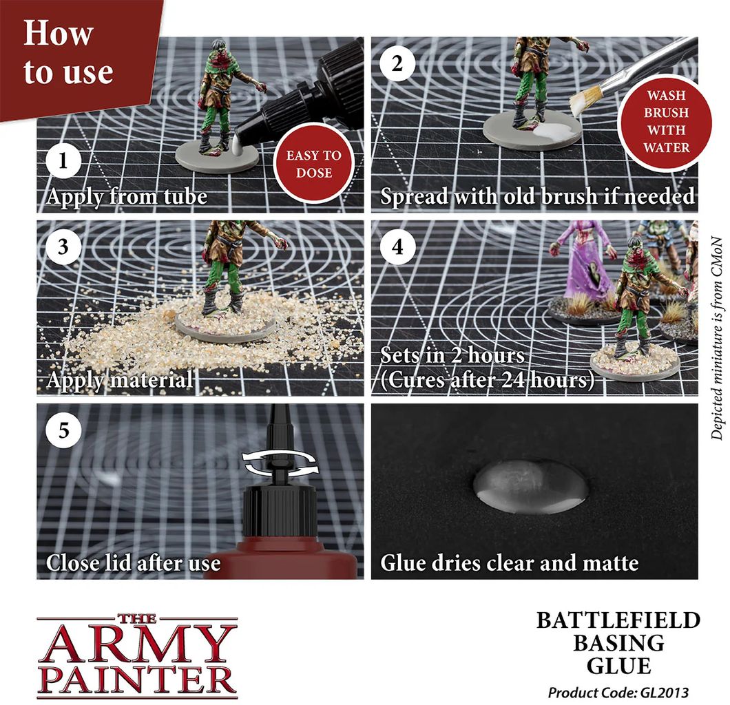 Basing Glue dolazi u praktičnoj bočici s kapaljkom s preciznom mlaznicom za lako nanošenje i precizno doziranje. Twister čep drži ljepilo dulje svježim.