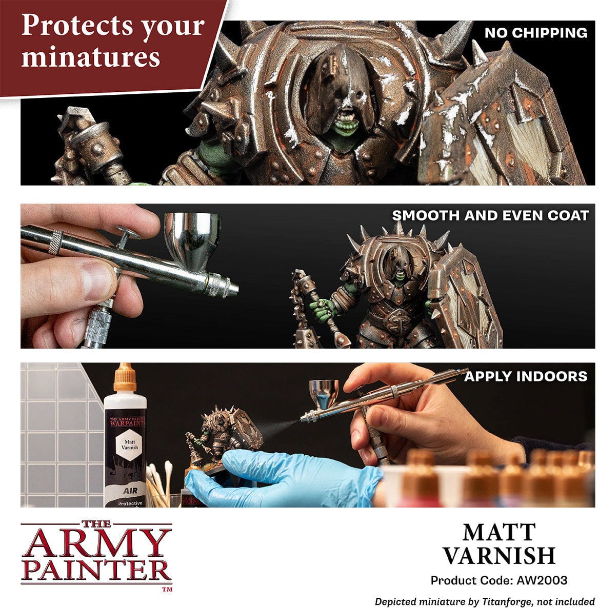 The Army Painter Warpaints Air Varnish je visokokvalitetni, vodeni akrilni lak za primjenu pomoću airbrusha. Pruža jednoličnu, glatku zaštitu i pouzdano štiti Vaše minijature od trošenja, ogrebotina i pucanja.